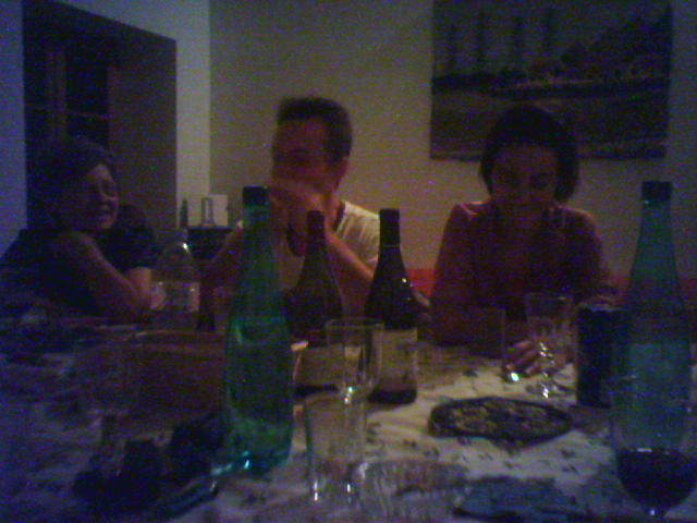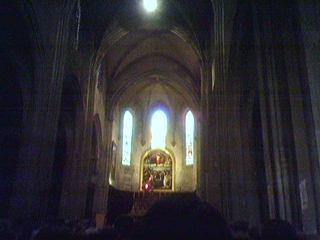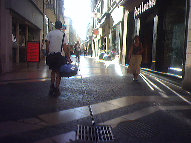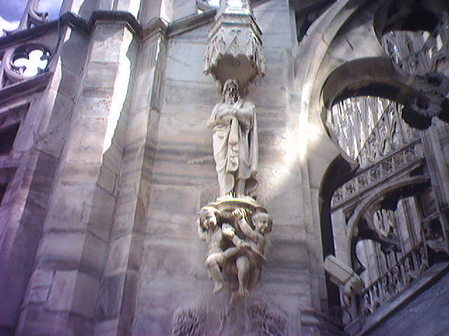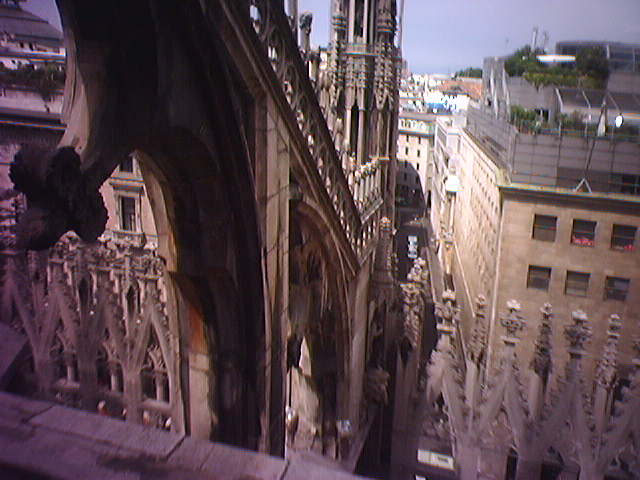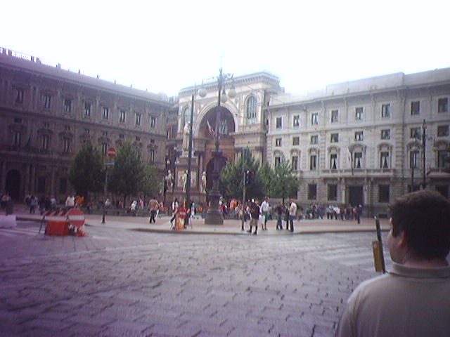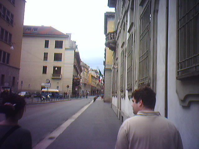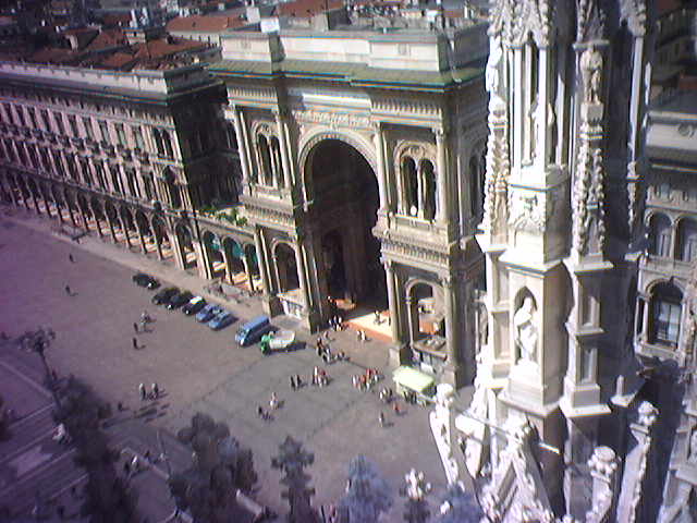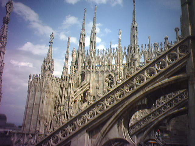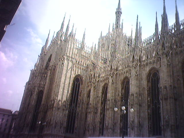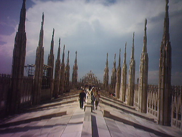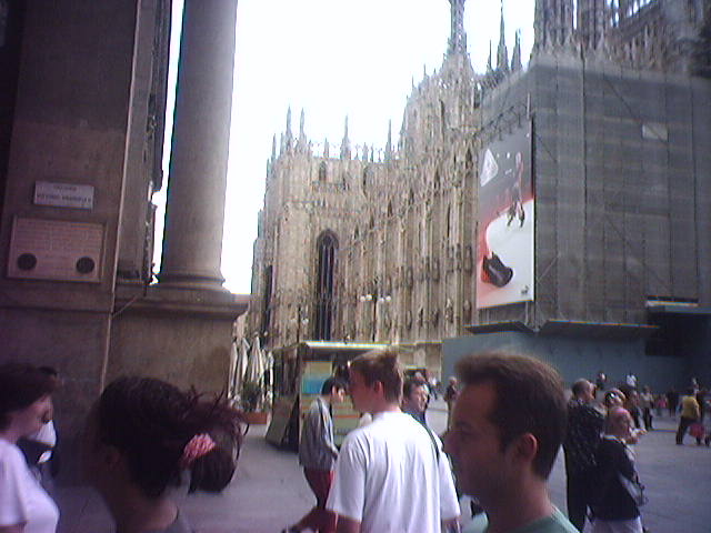 It was pretty noisy in the hotel, due to the fact that our only 2 windows faced the street , the very busy street. Not that the noise really bothered me that much, since I do live in the Comet Way house. With a good 5 hours of sleep under my belt, I awoke near the time of noon, checkout time. Soon, we were off, with the City of San Remo behind us we approached Genova. The small road that we took all the way to Genova provided a great view of the ocean [ MORE] and the many beaches that we past. We made a short stop at one of the several beaches to stretch our legs. Being that beaches seem so popular, parking was hard to come by. After a few smokes and a drink, we continued our way to Genova. It's hard to describe how beautiful the drive [MORE, MORE] was (my pictures don't even nearly do it justice, especially since I sat in the backseat during this part of the trip, so not so many pictures from the car), albeit because of the small road, our trek toward Genova was limited to a velocity of roughly 50 kph, in otherwords, a crawl in comparison to the autostrada. I passed most of my time looking for wireless networks, needless to say, there were none, none the whole way. By the time we actually got to Genova and found a place to park, it was around 4pm. The problem with our current situation was that the majority of the food establishments were closed for business between 2-6pm. After some walking through the city of Genova we found a store that sold premade food stuffs, I had some breaded shrimp on a stick, and we ate the food on a bench. Within minutes, we were accosted by a swarm of pigeons, who seemed brave enough to almost walk right up to you and eat the food in your hand. A swift stomp of the foot convinced them otherwise. Because of a small mistake in the parking arrangements, we had an extra hour to kill, what better way to kill time than go to a bar? Because I was a little thirsty, I opted for a bellini, that is peach juice and champange for those of you who are not versed in the joys of cocktails. Next, it's time to get serious and start getting into the whiskey. A couple of drinks later, we were back in the car and looking for the autostrada, and looking, and driving, and looking, and driving. It seems we were lost, and taking an involuntary tour through the city. Now, I thought cities in france had bad roadside markings, but Genova was the worst that I've seen. Concentric round-abouts, unmarked by any street signs, leading to a spiderweb of roads, which aren't even marked if they are one-way. When we did see signs, they were in italian, of course, and the 3 of us didn't know any italian. After some unknown time of driving around Genova, we finally found a sign for the autostrada. This took us to the highway that leads north to Milan. Being a little tipsy with not much to do in the backseat, I feel asleep. I wake up just as we're exiting the autostrada into Milan [MORE, MORE, MORE]. It's around 8pm or so. I contact my friend Federico over AIM via my pager. He's just getting off work and is going to go grocery shopping for our dinner. He gives me his address and some other street that is near his house. We drive around aimlessly through Milan for a little while before Cheryl decides to buy a map. I also check mapquest via my pager, no luck. Eventually we found his place, but now the hard part: finding a place to park and deciphering the cryptic parking signs. Federico is back on AIM, which means he's probably home. After ringing the buzzer, we are let through a set of REALLY big doors and a nice little courtyard and soon after we're greeted by Federico, introductions were made and we make our way into his house, a very nice place. Pasta with pesto and a salad was to be our dinner, along with 2 bottles of wine. Cheryl and Laurent fall asleep while me and Federico talk for several hours, some of which being a reliving of some old times we had in the game Everquest where we both played on the Rallos Zek server, good times. After a few hours of sleep, we went out [MORE] to look at the shops [MORE]. I was told that Milan was the fashion capitol of the world, something that I wasn't particularly interested in. I did think about buying myself a new suit, Italy had some of the best fabrics for suits in the world. I was also planning on buying my girlfriend something, but not knowing her measurements or anything, my options as far as fashionable gifts were pretty slim. Turns out it really didn't matter, most of the stores were closed. It seems that the month of August was vacation time for these people. We did go to some Armani or something place, where the the T-shirts were 70 euro and sweaters were over 500 euro. Lunch was good ole italian fast food, pizza. Surprisingly, it wasn't much unlike pizza I eat at the states. We also visited the Duomo (sp?) [MORE], a big church that is right at the center of the town. You can visit the outside, 250 steps up to the tower and from there you can walk around the upper perimeter [MORE, MORE] of the church. The detail of this church was amazing, every arch, every little nook, every spire was different, with different biblical scenes depicted or historical figures. Later we went inside the church itself. There were tombs of famous italians, including some Medici, that lined the walls, along with some very large paintings. The room itself was huge and lined with stained glass. Afterwards, we made our way to a bar/icecream shop, where Federico, Laurent, and Cheryl indulged in some icecream, and I, noticing the shelf of single malt scotches, chose to indulge in whiskey. After mistakingly ordering a slush drink thinking I was getting a glass of Bowmore, Federico came and helped correct the mistake. On the way back to Federico's place, we stopped by a grocery store to stock up on Limoncello, a lemon flavored liquor that is served ice cold. We'd been walking around for a good 4 and a half hours now, and we needed to head back to Avignon soon, Agnes' birthday