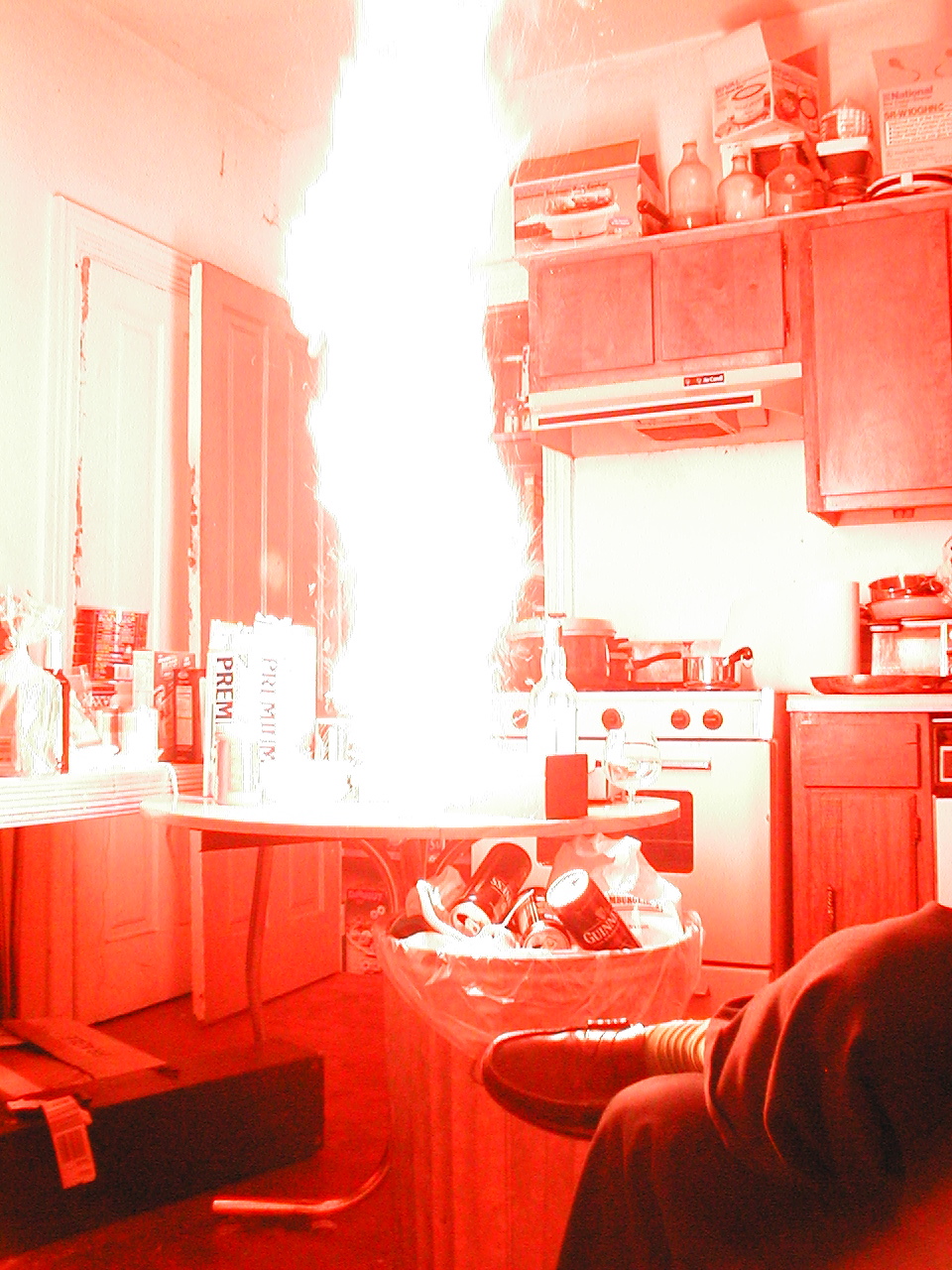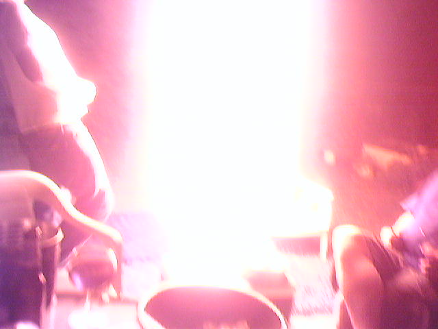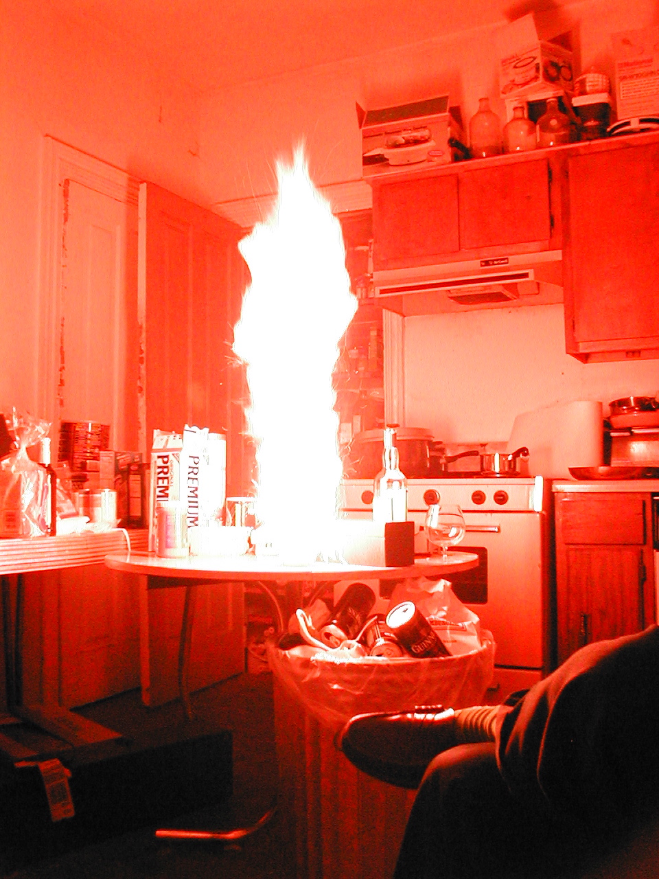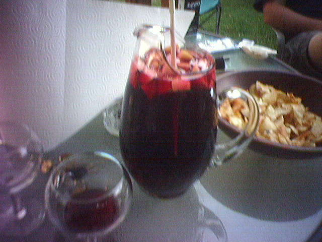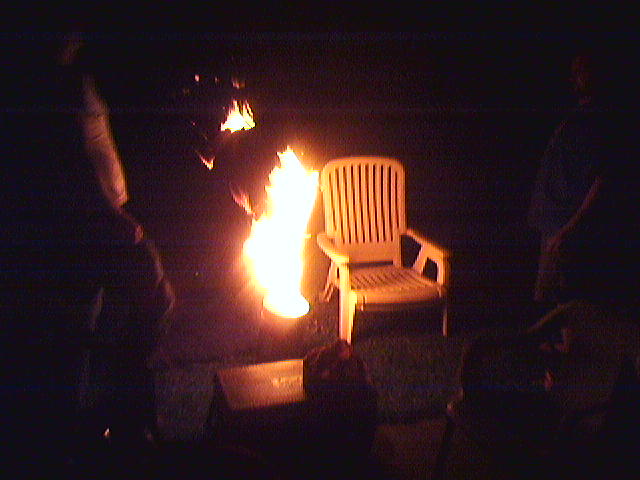 A buddy of mine had a get-together the other night (Friday I think it was). There was the usual heavy drinking and comradery associated with such events. But the highlight of the evening, along with the fact that I took a few pictures, warrants that I update my website as such. So my friend Rick invited us over for BLT's (that is Bacon, Lettuce, Tomato; just to be clear). The bacon was impeccable, with the added basil leaves, there was a creation of a most savory sandwich. Then came the Sangria, made from the cheapest wine available (Paisano, $11 for 4 litres) plus perfectly rippened cherries and blueberries, and some apples (note that the picture was taken when the sun was still up). A few hours and a few litres of sangria later... we have exhibit A, a concoction of much gun powder in a small barrel, lit with a match. Soon after, the barrel was doused with something flammable and the fire was reinvigorated, albeit, it was no explosion. Then came the coffee tin that held the remainder and the majority of the gun powder (this picture doesn't do the actual combustion justice, as it burned violently for more than 10 seconds with this intensity, shooting a flame similar to the exhaust of a rocket engine into the sky). This eveming was a reminder of a time long past, where instead of sangria, we had single malt scotch, and instead of a barrel of gunpowder/coffee tin, we had the tin which the scotch was stored in: Hot stuff in the kitchen of Comet Way, and Hot stuff with oregano and basil. Although the Comet Way gun powder burnings were not graced with the presence of Rick, he did, however, provide the gunpowder. 3 Cheers to the joyous combination of gunpower and booze.