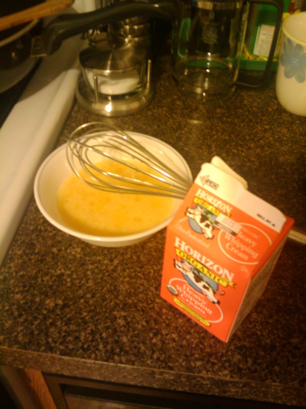 Whisk together the 3 eggs with 2 tablespoons of sugar and some milk/cream.