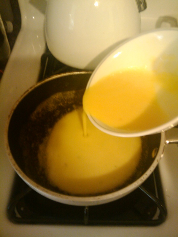 Turn the heat down to low and pour in the eggs.