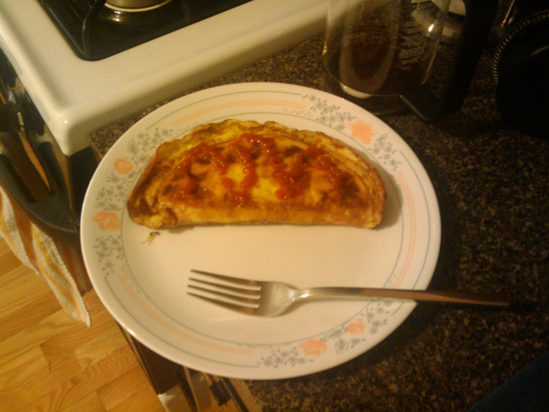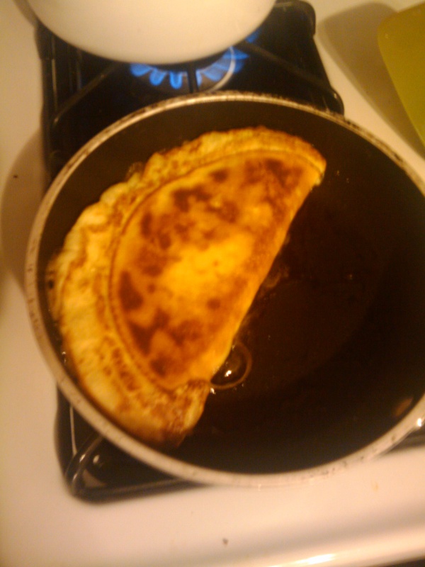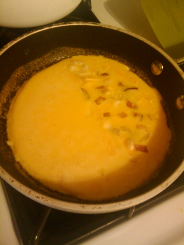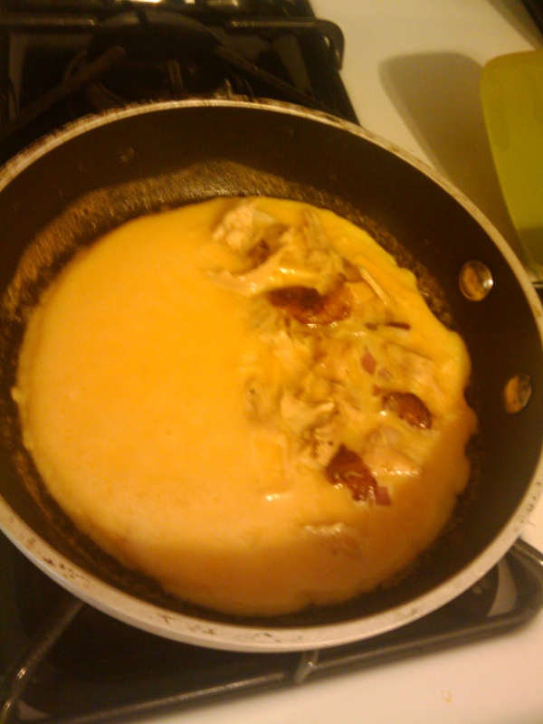 When the eggs have mostly cooked, fold the omlette and give it a flip.